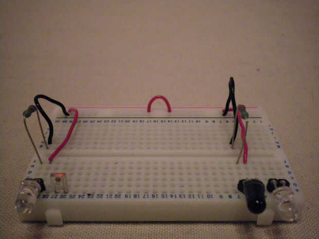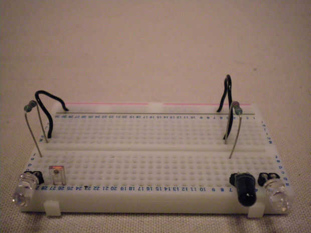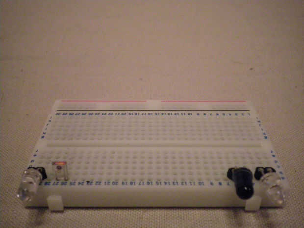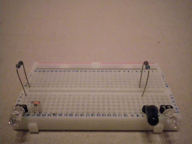 Ahora vamos a Inicio cableado el LED infrarrojo primera colocar una resistencia de 220 ohmios en la misma fila que el cátodo de LED IR luego del alambre a tierra y asegúrese de conectar ambos. A continuación se que necesita cablear tanto de los ánodos de los LED IR al tren de potencia.