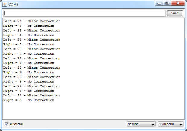 Una vez que hayas subido el bosquejo a tu Arduino abre el monitor de serie y usted debe notar una serie de valores estado impreso en la ventana por ejemplo «Izquierda = 21 – corrección menor».