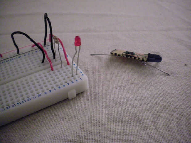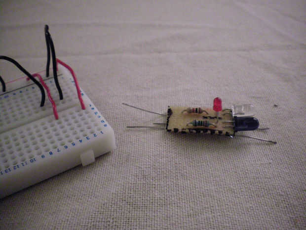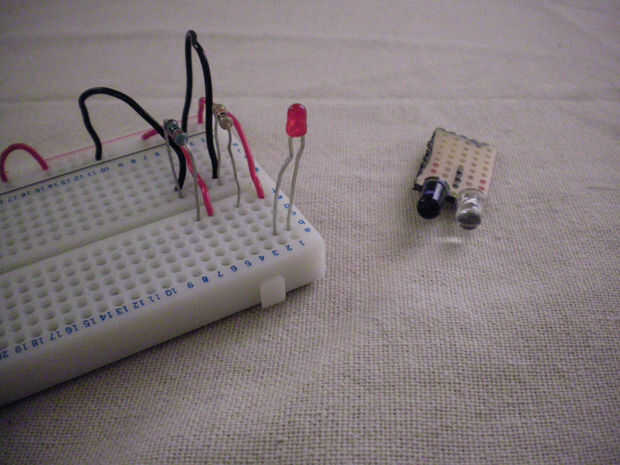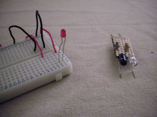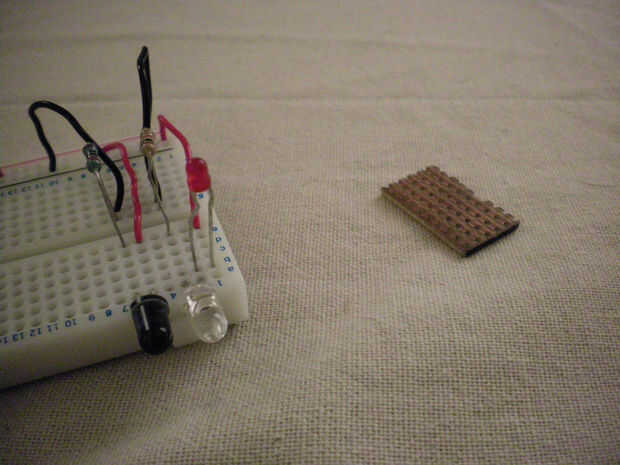 Tome los componentes uno por uno desde tu tablero de pan y recrear el circuito en el tablero de la tira igual que creó el prototipo de tabla de pan, comience con los IR LED y foto transistores.