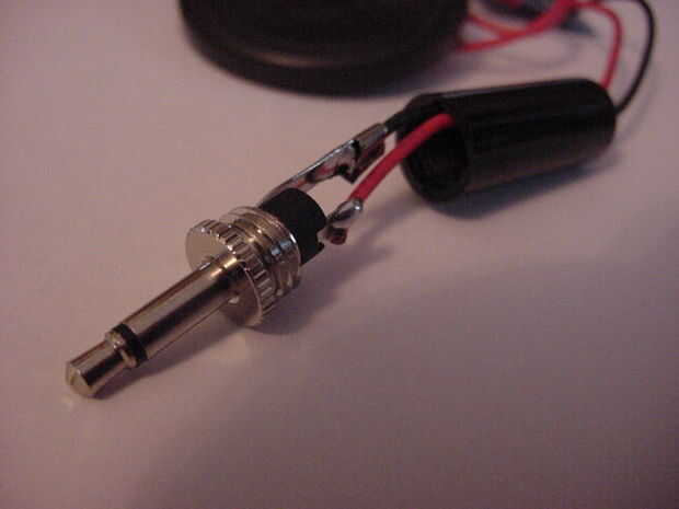 asegurándose de dejar los cables conectados a la tarjeta de sonido. El enchufe de teléfono de 1/8" a los cables de la soldadura, asegurándose de que el cable negro está soldado a la patilla más larga, el rojo a la patilla más corta.