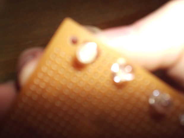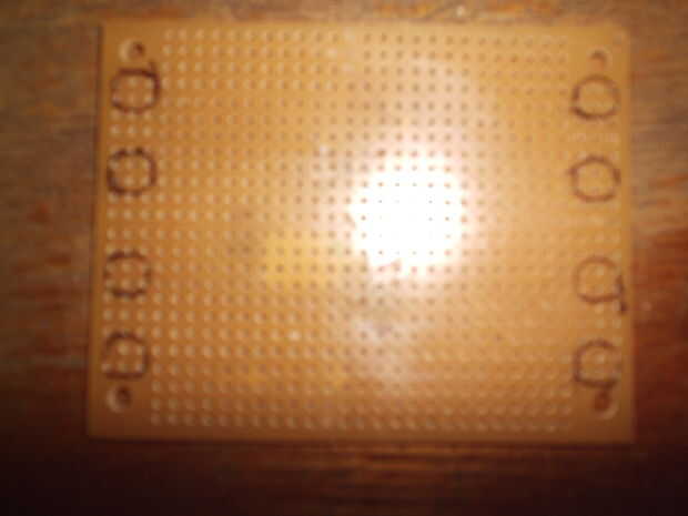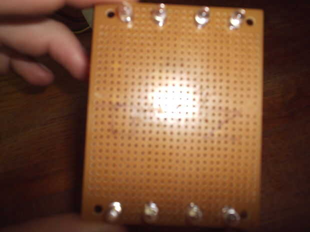 Ahora tenemos que averiguar donde va a soldar el LED. Coloca una cadena de cuatro LEDs en cada extremo de la placa. Recomiendo ponerlos un par de agujeros para que los LEDs no sobresalgan del borde. Ahora usted puede soldar en su LED que son contra la Junta, pero le recomendamos que deje los LEDs sobre una media pulgada por encima de la Junta. Haciendo esto que hacen que usted puede mover cada LED un poco si es necesario. Una vez usted haya calculado hacia fuera el espacio de cada sorteo de LED un círculo alrededor de él para que cuando se suelda sepa donde va cada LED. Una vez que tengas todas las posiciones de LED marcadas está listo para pasar al siguiente paso y empezar a soldar.