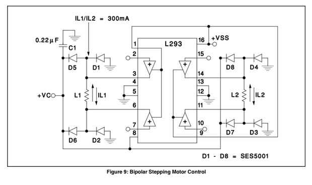 El pin 1 va en e13 para nosotros. Todas las coordenadas dadas se basará en eso. La parte superior del chip es donde el pequeño divit. Sólo por diversión hemos incluido algunas fotos de la hoja de datos (adjunta a este instructable), incluyendo el diagrama de pines. Conveniente también tienen un esquema de aspecto muy oficial para el control de un paso a paso bipolar. Es más o menos lo que estamos construyendo. Vamos a construir nuestro propio esquema derecho junto con este tutorial que puede comenzar a ver la conexión.