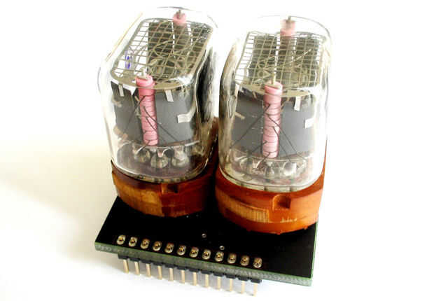Las dos cabeceras macho recto de 12 pines deben insertarse en el lado de la mesa enfrente de los casquillos de tubo nixie. Si ambas de estas cabeceras se insertan en la Junta del tubo de nixie al mismo tiempo, pueden ser más fácilmente soldado mientras mantiene en su lugar por el peso de la Junta.