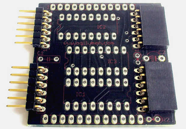Insertar los encabezados de 6 pines machos y hembras ángulo recto como se muestra y comenzar a soldar. Estos encabezados pueden celebrarse en el lugar por el peso de la Junta. Anclaje de los pernos con soldadura en cualquiera de los extremos primero y confirman la posición final, antes de soldar todos los pines.