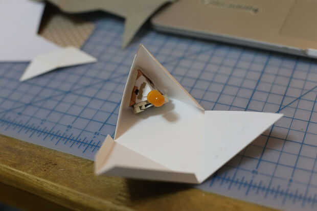 Pegar la parte inferior de la forma externa junto con el formulario interno junto, con las pestañas de la forma externa que cubre los circuitos en forma interna. Utilice un palo para forzar las pestañas para ir junto con el formulario interno si es necesario (el dedo probablemente no puede llegar esa brecha) que se pegan bien. Luego, cierre la parte superior de la forma externa (suavemente las pestañas de trabajo y cantos, sostenga los bordes si es necesario, tratar de no exprimir el inestable-aún los bordes).