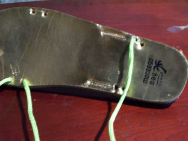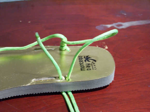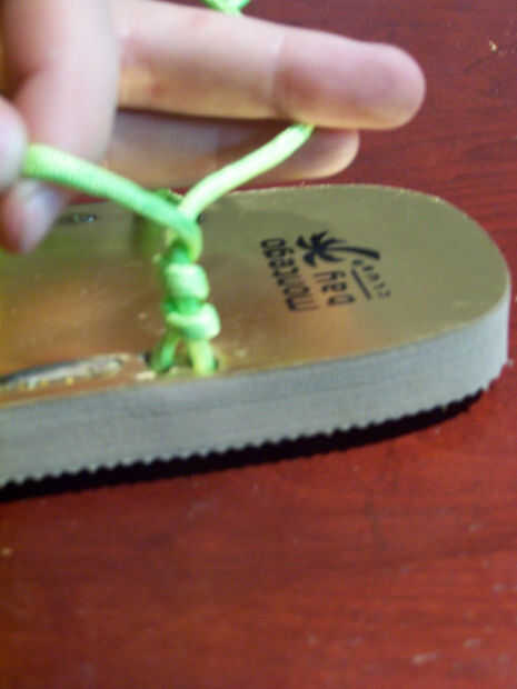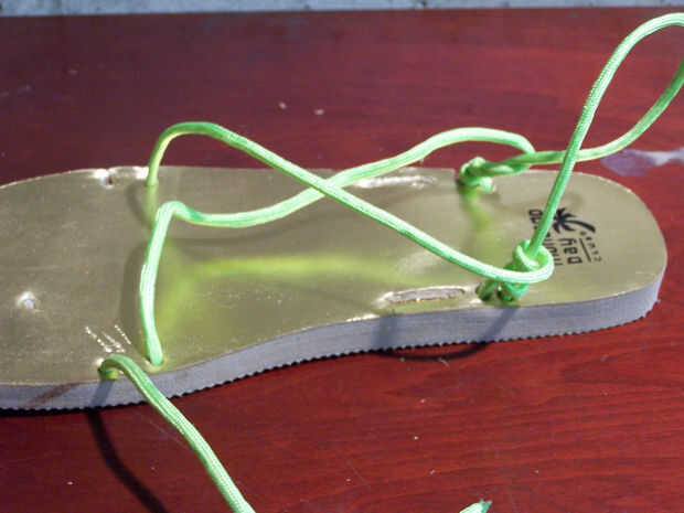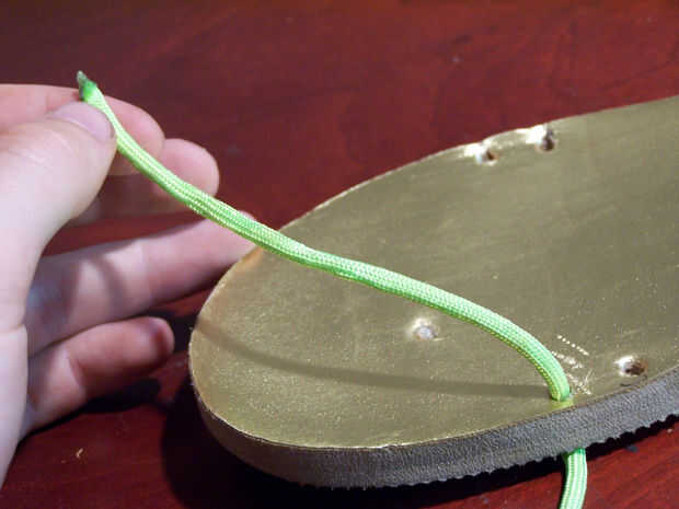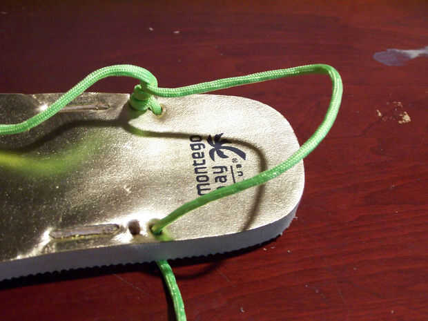 3) ahora cruce el flip flop diagonalmente y pasar por el primer agujero en el lado derecho del tobillo. Asegúrese de dejar suficiente holgura para el pie, para ir entre el molle y el ' flop.