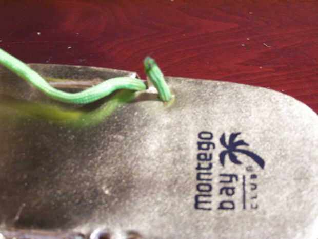 5) teniendo cuidado de dejar suficiente holgura, decir tres o cuatro pulgadas, bajar por el agujero trasero en el lado izquierdo del tobillo. Sabrás que tienes suficiente holgura cuando puede tira el bucle a sobre dónde está la parte posterior de lo flip flop.