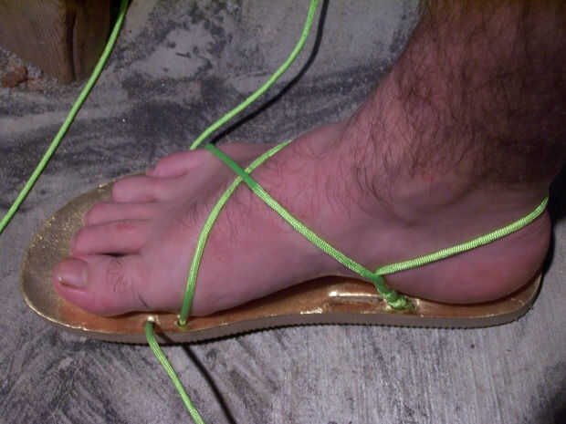 Poner el pie en los bucles, tomar los dos extremos sueltos del paracord y tire. Puede que tarde un poco más mover y maniobrar para conseguir todas las cuerdas apretadas, pero usted sabrá que está apretado lo suficiente cuando está cómodo en su pie.