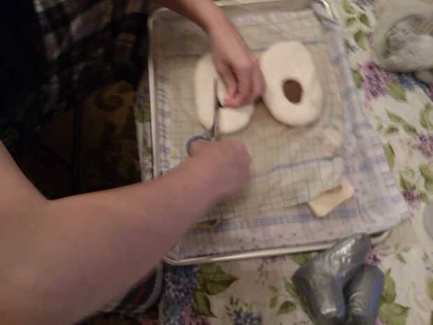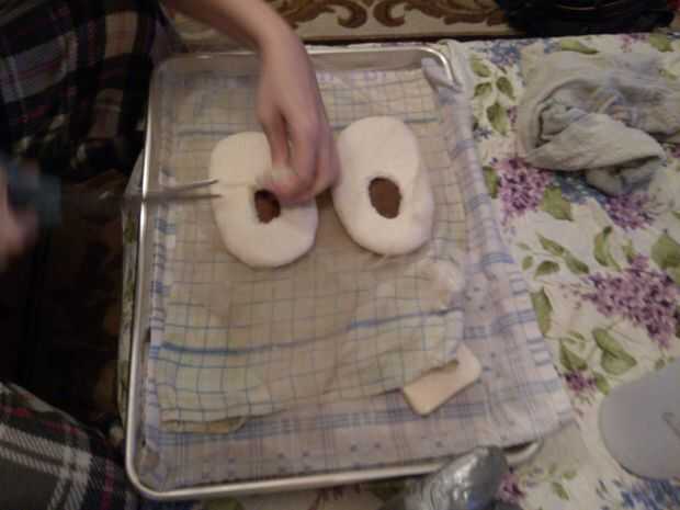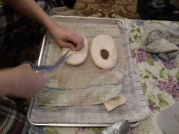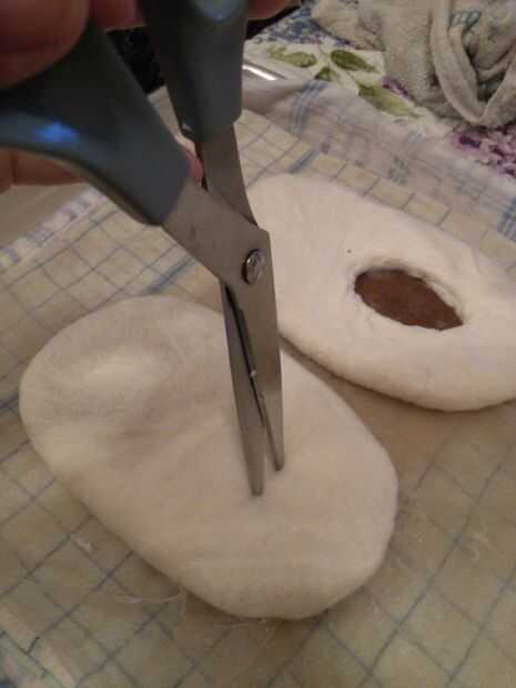 Comenzar colocando la última sobre el fieltro y encontrar el centro del tobillo. Se trata de la parte posterior del agujero. Usando un par de tijeras afiladas, pellizcar el fieltro y corte hasta resistir. Tijeras puntiagudas como bordado o manicura Tijeras funcionará mejor que tijeras redondeadas tela descubrí.