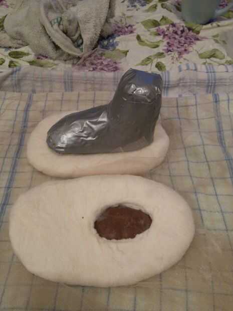 Una vez que ha cortado todo el camino hasta la resiste, quiere cortar un óvalo que se extiende a la mitad del zapato. Utilicé el punto de entrada como una guía para qué tan amplia debe ser el óvalo, así que el fieltro restante era el mismo ancho en todas partes pero en la parte delantera del agujero. En caso de duda, corte más pequeño. Es más fácil agrandar el agujero que hacen más pequeño.