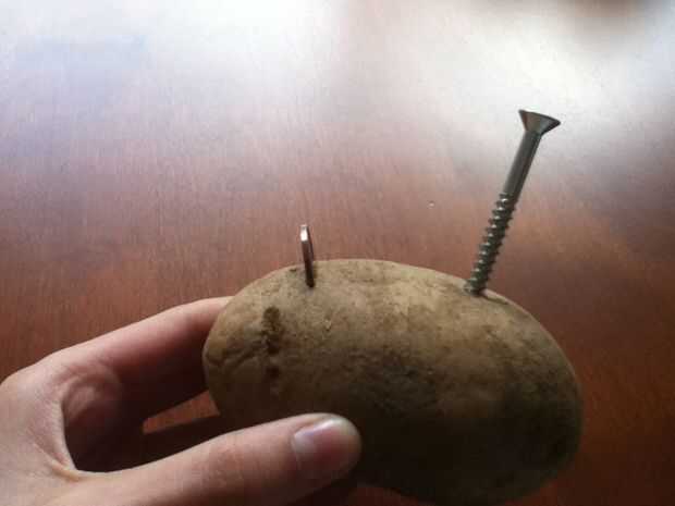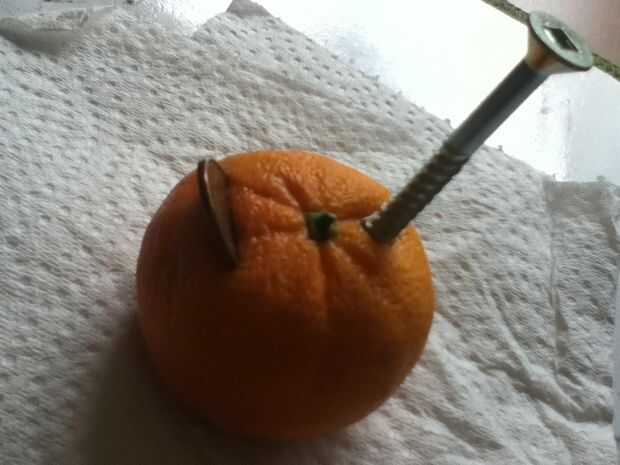Tomar el cuchillo y cortar dos pequeñas ranuras en la parte superior de su producto, unos 2-3 pulgadas aparte. Poner el centavo en una hendidura y la clavo o tornillo en el otro. Puede que desee mantener las toallas de papel cerca si está utilizando una fruta jugosa.