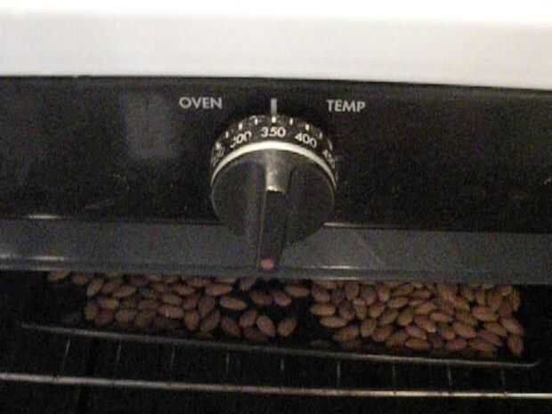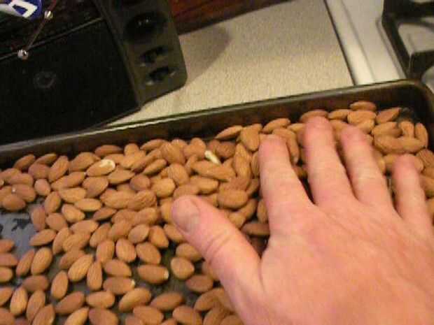 Extendió una libra de almendras crudas en una bandeja para hornear sin engrasar y hornear en un horno de 350 centígrados durante 9 minutos.