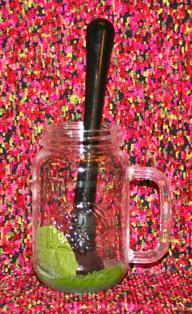 Poner un puñado de hojas de menta en el fondo de cada vaso y machacar (molido con un mortero) y añadir el ron, el jugo de limón y el jarabe. Luego machacar un poco más.