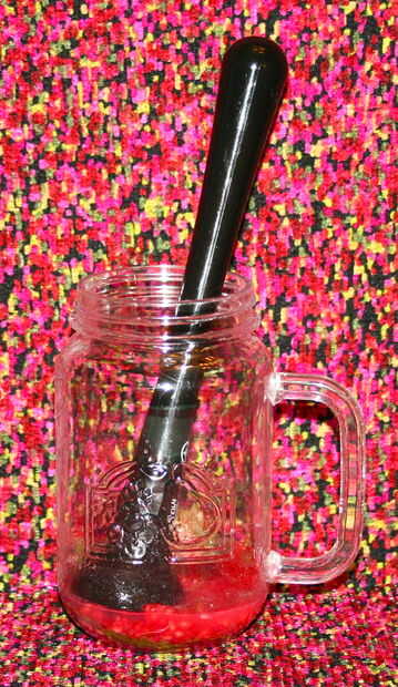 A continuación, añadir un puñado de frambuesas frescas y usar el machacador puré encima y mezclar en la base del mojito. Ahorre unos frambuesas enteras para agregar más adelante.