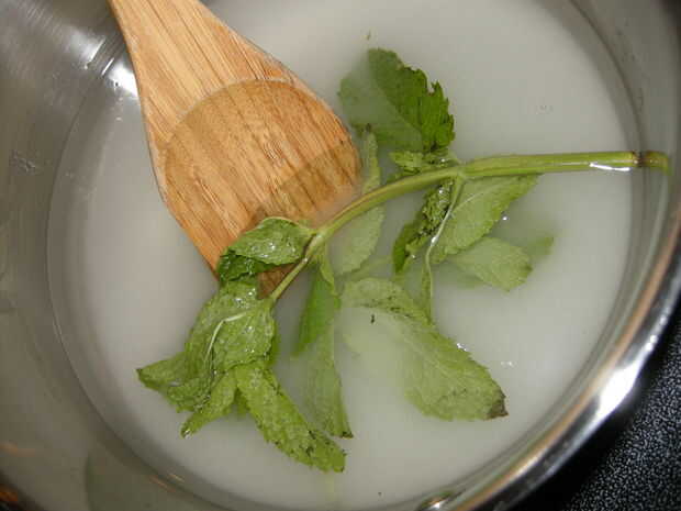 • (Opcional: puede utilizar menos agua al principio y añadir unos cubitos de hielo después de que el jarabe hierva. Esto acelerará de enfriamiento).