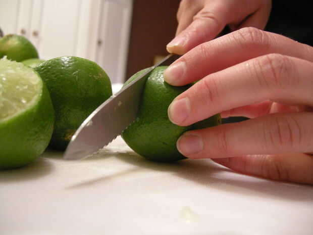 • Cortar los limones por la mitad con un cuchillo y colocarlos parte cortada hacia abajo en un exprimidor de mano cal y exprimir lejos!
