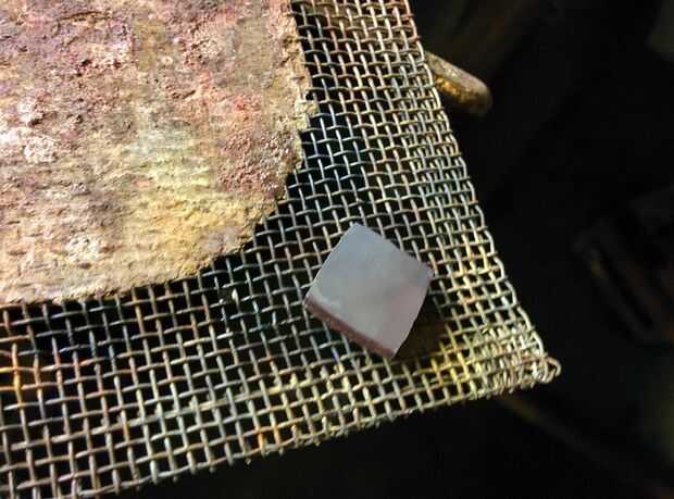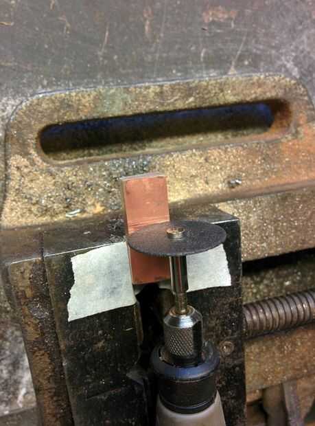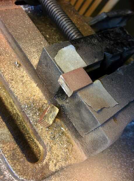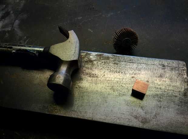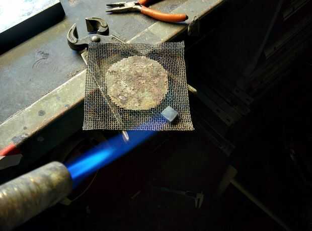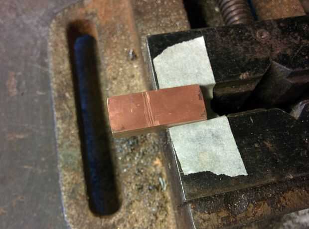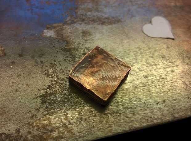 Primero se corta una pieza cuadrada de tocho con una herramienta de corte de Dremel. Esto dejó una gran parte de la palanquilla que utilizaré para otra pieza más adelante. El billete era demasiado grueso para un colgante así que tuve que reducir el espesor a la mitad. Lo hice por golpear con un martillo en un bloque de acero. Simple y llanamente. El martillo fue pulido en una pulidora de disco así dejaría marcas como pocos como sea posible en la superficie. Al llegar cerca del 30% reducción (no importa cómo se forma el billete, si se dibuja, rodar, martíllelo ect.) debe ser recocido para ablandarlo de nuevo. Cuando usted se lo que trabajas endurecerlo, así necesita para calentar hasta un rojo embotado y saciar en agua para ablandar para arriba. No recalentamiento lo, sólo necesita un ligero resplandor rojo.