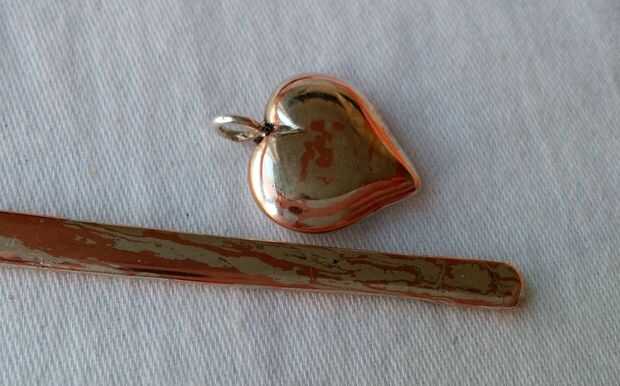 Nota final sobre este proyecto. Puesto que la plata es más noble en la serie galvánica de cobre, corrosión galvánica puede ocurrir entre estos metales. Si la joyería es a menudo húmedo o expuesto a sudar el cobre finalmente comenzará a mostrar signos de corrosión. La tasa de corrosión es altamente dependiente de las circunstancias, pero un colgante así fácilmente hará décadas antes a la corrosión. Un anillo no durará siempre, a menos que utilice metales nobles en el mismo estado galvánico. Cobre puede también color a la piel un poco, pero un colgante como esta será movimiento alrededor tan a menudo será mínima.