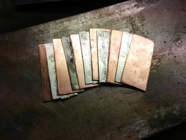Para hacer el billete, aplasta la pila de capas entre dos placas de presión y aplica calor. Si hay presente de la soldadura, si fluyen antes de la plata se funde y así unen el cobre y la plata. Para asegurarse que hay suficiente soldadura, es una buena idea de presolder las hojas de plata. Para ello limpiar la hoja de plata, lo del flujo y coloque algunos trozos de soldadura sobre la superficie. Luego calienta la plata hasta que la soldadura fluye y se convierte en algo nivel. Utilizar soldadura dura ! No tiene que ser que bonito o incluso cubren toda la superficie, sólo tiene que ser bastante plana. No necesitas usar un montón, sólo cubren alrededor del 25% de la superficie.