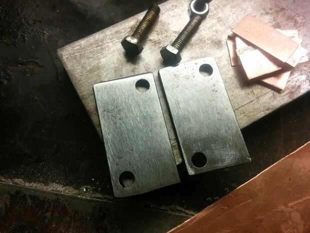 Corte el acero en dos pedazos por lo menos 15mm más largo que las hojas. La razón de la longitud adicional es que usted necesita perforar agujeros para los tornillos que proporciona la presión sobre el billete. Sólo tenía dos pernos, pero recomiendo tener cuatro. Utilicé tornillos de grado 8.8 M6.