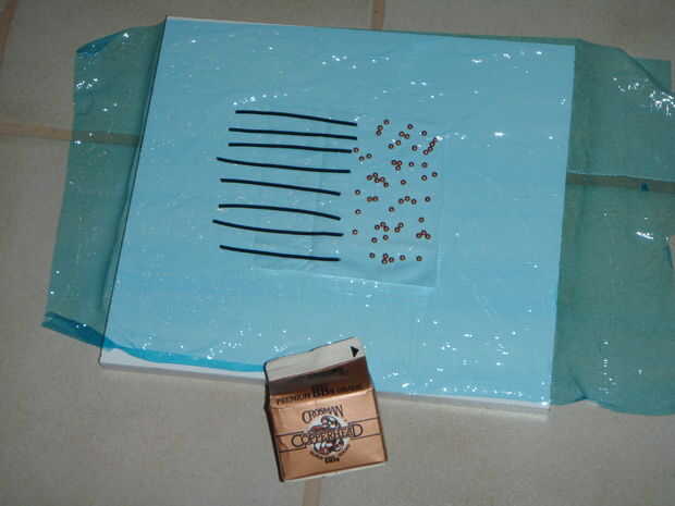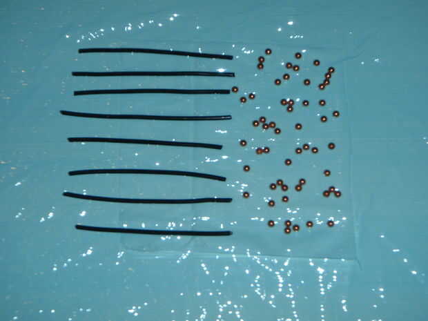 - Organizar sus materiales de dibujo en la hoja de la plantilla. Para la escala patrón mokume, he utilizado varios trozos de filamento plástico de unos 3mm de diámetro, alineado en una fila (palillos de dientes habría funcionado demasiado). Para el patrón de birdseye, utiliza acero BB (4.5 mm de diámetro) dispuesto al azar.