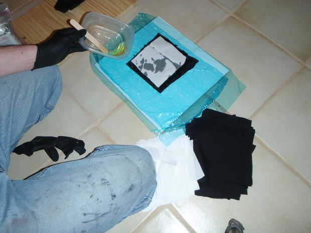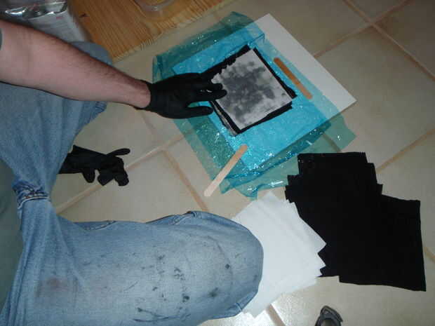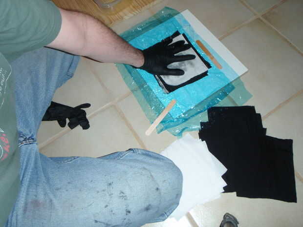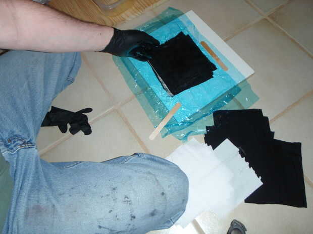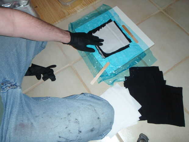 - Coloque su primera hoja de tela negra sobre su material de dibujo y cubrir con una fina capa de resina epoxi mezclado. Toda la hoja debe ser ligeramente cubierta.
