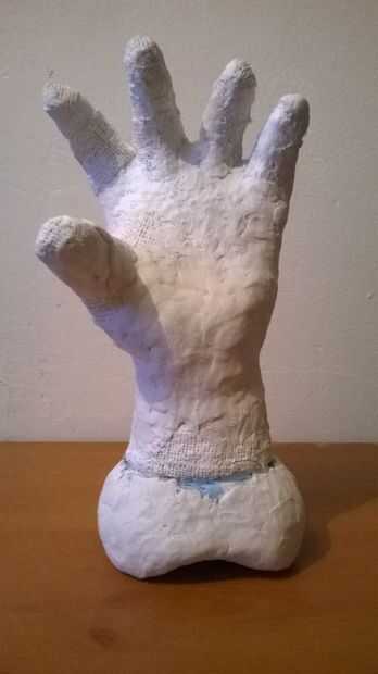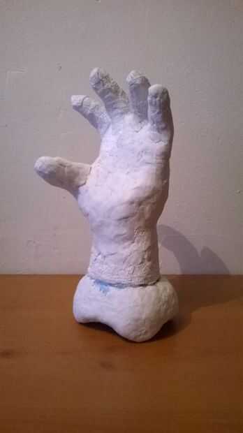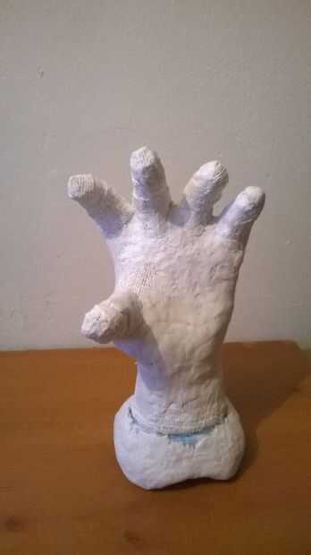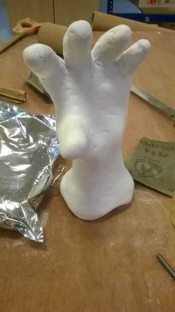 utilizar aire seco arcilla para sellar el espacio entre la mano y la base, este también hace la mano como un producto acabado mucho mejor. seguir a estirar muy fina 30mm en piezas de 30mm y aplicarla a la superficie, asegúrese de que mantener las manos húmedas para permitir que la arcilla sellar correctamente. continuar hasta que ha presentado la superficie del producto y espera a que endurezca.