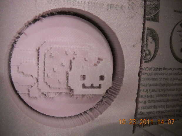 Al final, usted puede tomar una pistola de aire caliente para limpiar la espuma "fresas" restos de molienda (ver foto 10/23 14:07). Esto derrite el poliestireno un poco (ver foto del 10/23 15:34), por lo que no era realmente apto para nyancat pixelado con esquinas agudas; Escogí sólo manualmente la mayoría de los pedacitos de espuma.