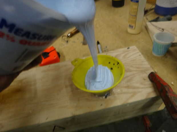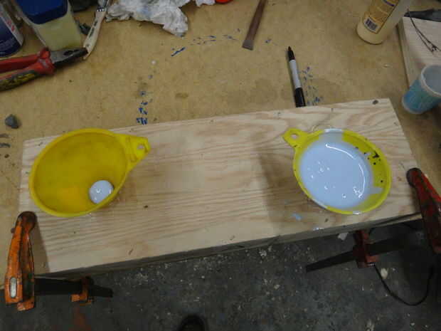 Lentamente Vierta la silicona en uno de los embudos. Sólo Vierta en un agujero hasta que el otro agujero puede funcionar como un sistema de ventilación. Si vierte en ambos orificios, hay la posibilidad de que se forma una burbuja de aire, arruinar el molde. Vierta hasta que la silicona llegue a la parte inferior del embudo de la ventila de aire. Si no mezcla suficiente silicona para llenar el molde no te asustes, simplemente mezclar algunas más, tienes tiempo. Excepto algunos del silicón de la especialidad, más silicona tiene un muy largo tiempo de trabajo (tiempo de vida útil). Dejar que la silicona completamente curar durante la noche.