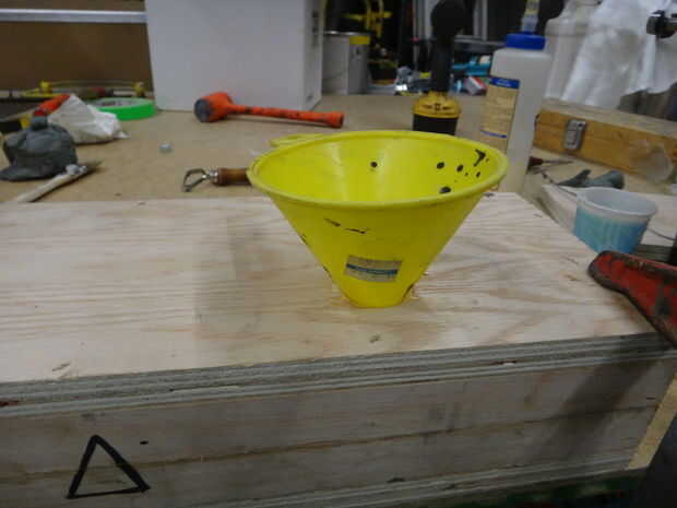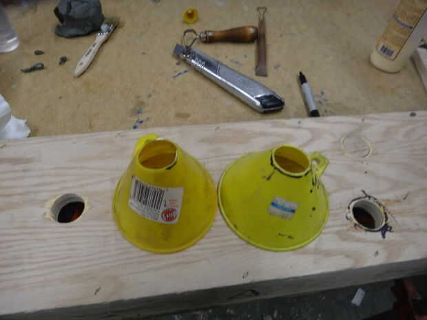 Establecer los embudos de plástico en los agujeros de relleno y marca donde se sientan. Corte a esa altura y luego caliente pegamento en los orificios de llenado. Estos hacen verter la silicona mucho más fácil y evitar cualquier desbordamiento que va en su caja