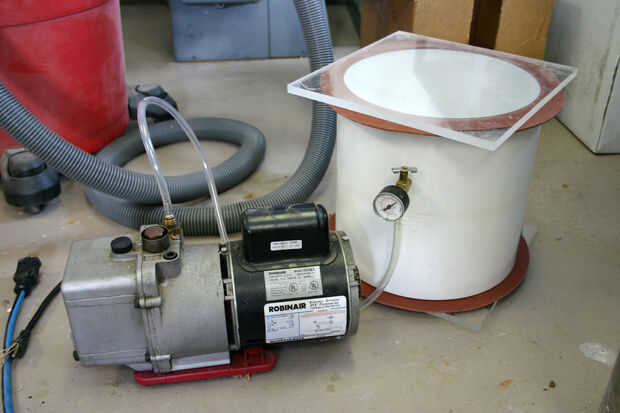 Con su cámara de vacío listo y todas sus herramientas hacia fuera antes de comenzar. Tienes un poco de tiempo antes de que la silicona se configura, pero siempre es mejor no hacer. En la foto, se puede ver en la cámara de vacío durante la desgasificación, la silicona se levanta un poco antes de derrumbarse abajo otra vez.