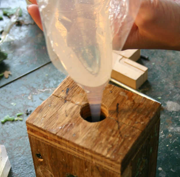 No revuelva como verter (añade aire) pero puede ser útil utilizar la varilla de mezclar suavemente a la silicona que es muy gruesa y a veces reacio a verter cuidadosamente. Verter un molde (diferente). Esto requiere mucha paciencia.