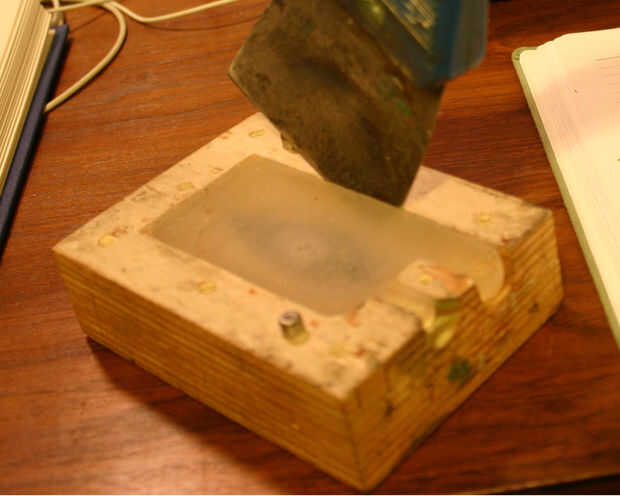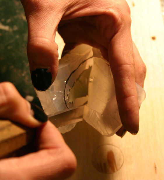 Una vez llego a salir la silicona de la caja, entonces necesito para obtener la pieza hacia fuera de la silicona. Si grabado y marcado mi cinta, esto no debe ser demasiado malo. La línea de partida será fácil de encontrar y cortar. Uso de cinceles de Jim para cortar en la silicona, asegurándose de mantener las dos partes tiradas abiertas como que cortar. Esto evitará que me accidentalmente cortar dos veces la misma sección o cortar en trozos. Sólo tienes que seguir la línea de cinta negra, tire de la pieza y la espiga hacia fuera y tienes tu molde! Enjuague el molde, séquelo con aire comprimido y rociarlo con silicona a la cera de liberación.