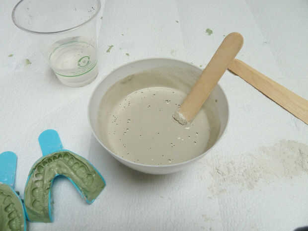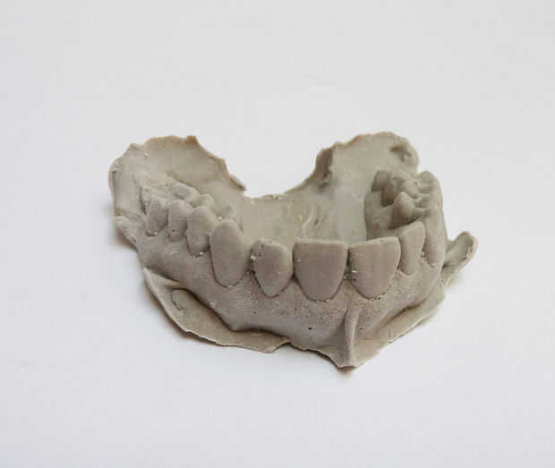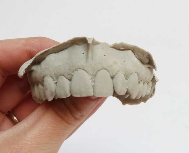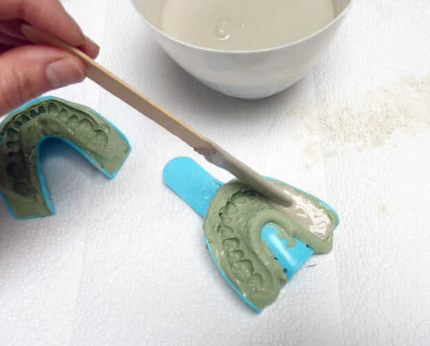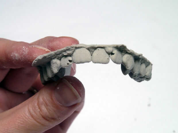 Después de aproximadamente una hora, los aspectos positivos pueden ser demolded. En primer lugar, retire cualquier exceso alginato y UltraCal de alrededor de la forma. Entonces, tenga cuidado al quitar el molde. Los dientes inferiores son frágiles porque no incluyen la paleta, así que suave.