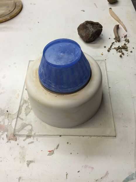 Para crear un embalse para el resbalón mientras slipcasting, usted necesitará hacer un segundo molde. Con cualquier objeto que tiene el mismo diámetro que el recipiente y un ángulo de inclinación buena, fije el objeto con la arcilla para el molde de la primera. También puede crear esta pieza de barro si es necesario. Construir un muro de retención de barro (fotografiado en el paso siguiente) para contener el vertido de la escayola. Excavar por lo menos tres agujeros de registro en el molde de yeso para un ajuste fácil una vez terminados los dos moldes. Para crear la versión, humedezca la superficie de tu molde del yeso de primera, jabón todas las superficies y limpie con una toalla de papel.