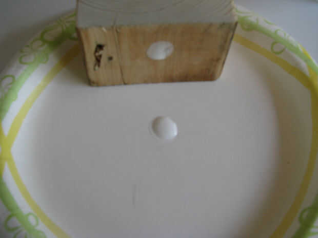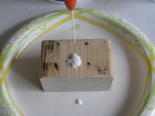 Así permite comenzar. Coge el plato de papel y pegamento. Es necesario poner un pequeño toque de pegamento en el centro de la placa. Poner el bloque de madera en la placa en el centro. Deje que el pegamento secando. Este paso no es absolutamente necesario, pero ayudará a detener la pieza de madera estable.