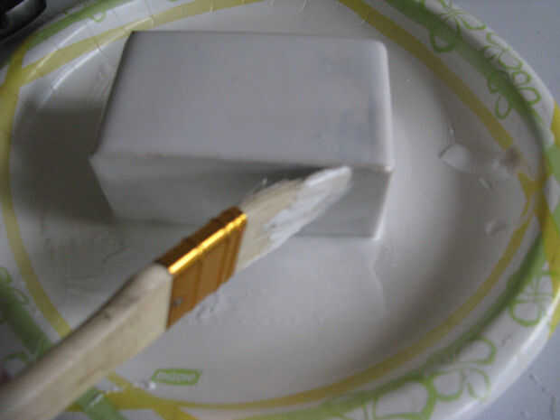 Una vez que su bloque de madera es estable empezar pintando el bloque de madera con pegamento de Elmer. Desea cubrir toda la manzana y el espacio entre el bloque y la placa. Esto será la base para su molde así que Tómese su tiempo y asegúrese de que no hay ninguna burbuja. La razón del pegamento es crea una superficie lisa para el constructor del molde. Tomar tiempo adicional en los bordes cortados con la proyección del grano y asegúrese de que esté suave. No desea que el constructor del molde pudiendo agarrar cualquiera de grano o será muy difícil de quitar.