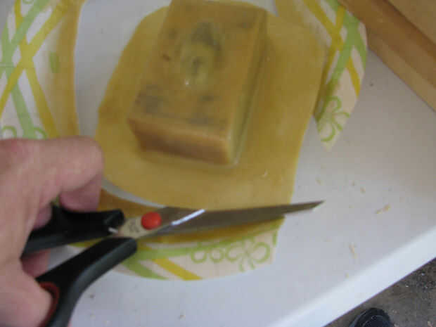 Cortar aproximadamente 2 pulgadas alrededor del molde. Suavemente Retire el molde de la placa de papel (deje la placa de papel unida por ahora si vas a hacer la caja opcional en el siguiente paso.) Puedes poner algún talco o polvo de talco en el molde para evitar que se pegue a sí mismo.