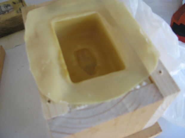 No tengo fotos pero construir una caja de aproximadamente una pulgada más ancha a cada lado del molde. Así que si tu molde es 2 X 4 X 1 se construirá una caja de 3 X 5 X 2. Tornillo de los lados y la parte inferior juntos. Atornille la parte superior pero luego quitarlo dejando parcialmente los tornillos por lo que será más fácil volver a poner.