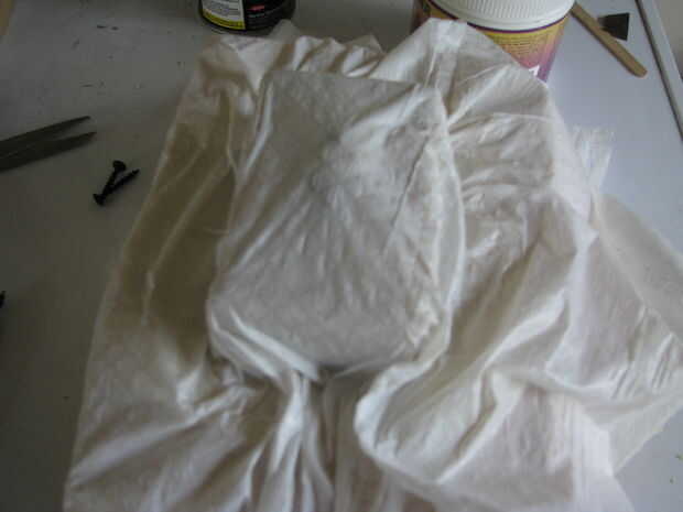 Coloque la parte posterior de madera en el molde y envolverlo cuidadosamente en una bolsa de plástico con el bolso va alrededor de la placa.
