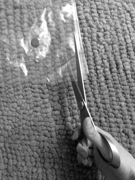 Coloque su nueva cortina de ducha en el piso. Corte en la parte inferior entera de la cortina de la ducha para quitar la costura. Este es el área principal donde se retiene el agua, un lugar perfecto para el molde crecer.
