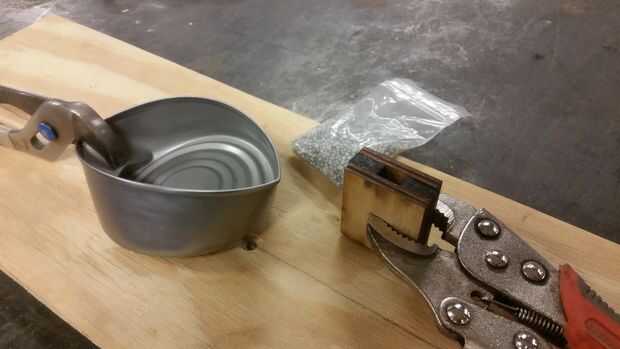 El estaño de fundición: Estaño es fácil de trabajar y tiene un punto de fusión lo suficientemente bajo que se puede derretir en una estufa o con una llama de propano, como la de una antorcha de plomería. Utilicé una antorcha de plomería y un atún con un pico curvado y llevó a cabo con seguridad con los alicates.
