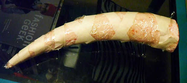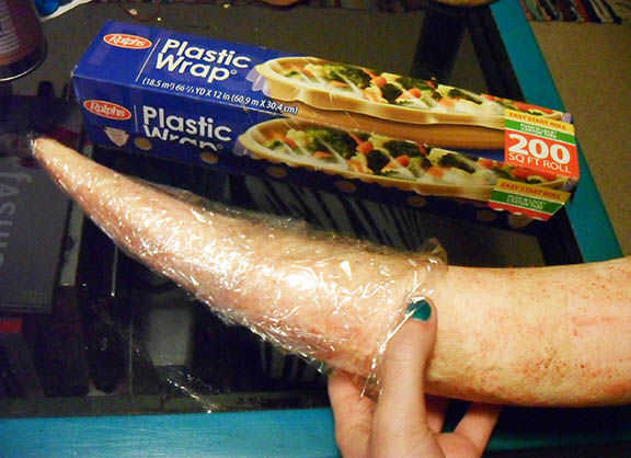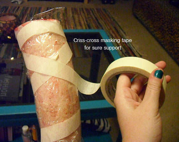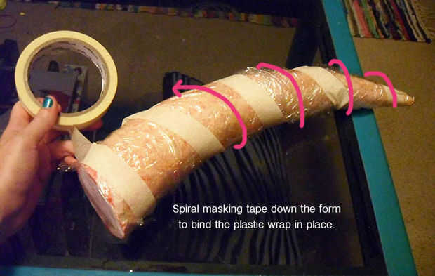 Cuando el objeto está envuelto completamente, use cinta adhesiva para asegurar el enlace. La forma de mi objeto había prestado a una espiral simple de cinta abajo de la forma y una segunda que va en la dirección opuesta. Su objeto puede requerir un enfoque diferente. Use lo suficiente como para no asegurar la envoltura se aferran--necesidad de momificar todo!