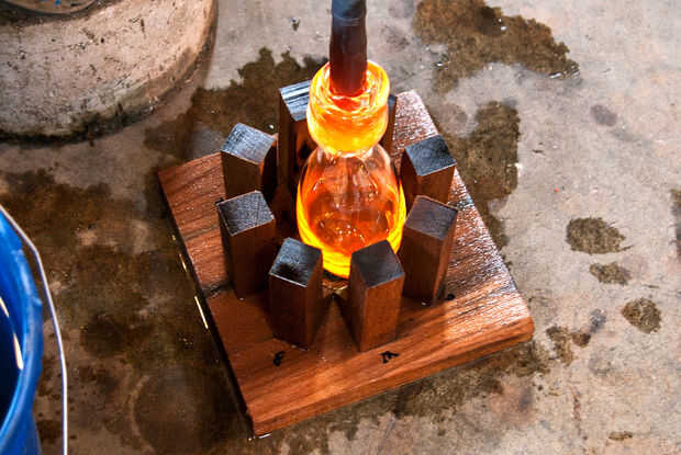 Para el soplado de vidrio de producción, los moldes se hacen generalmente de metal o grafito. La ventaja es que duran un tiempo muy muy largo. El molde de madera se muestra aquí es mucho más barato y más fácil de hacer, y todavía puede producir decenas a decenas de piezas antes de se desgasta. Yeso puede utilizarse también para hacer moldes, pero parece muy tedioso y sucio y prefieren hacer estos madera moldes en su lugar.