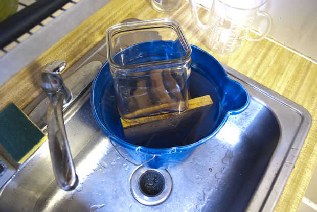 Este es un paso que realmente me olvidé, pero unos agujeros deben taladrarse en el zócalo, directamente debajo de la pieza. Si no haces esto, lo que puede suceder es el agua charco para arriba en la base y cuando el vidrio caliente en la parte superior del mismo, se expandirá en vapor y esto puede causar que el fondo del vaso protruya hacia arriba y cóncava.