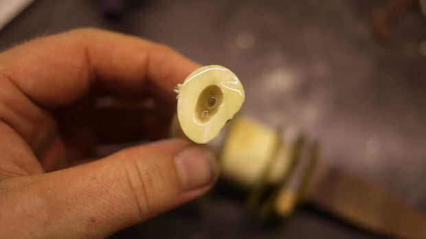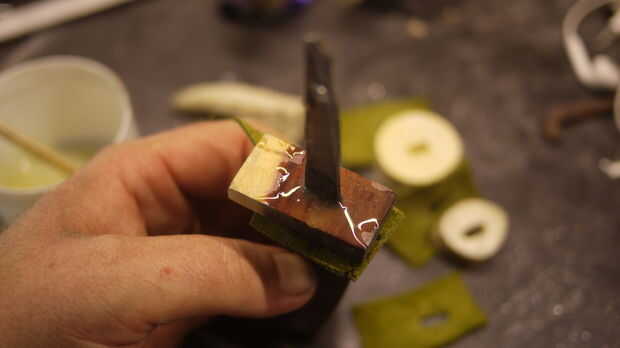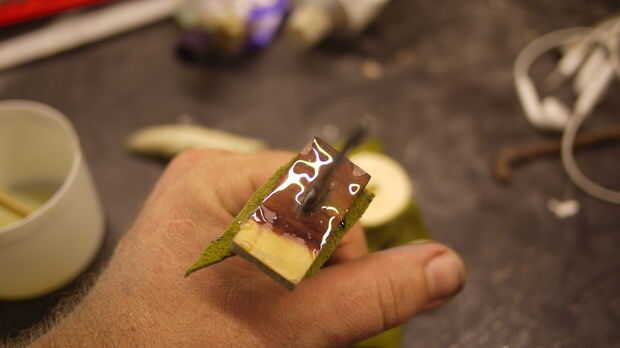 Antes de colocar la última pieza, relleno con epoxi Asegúrese de que hay no hay aire en esta pieza. Siga esta regla todo el camino como apilar las piezas asegurándose de que todo está lleno de epoxy. Empuje el pasador a través de la espiga y asegúrese de que tiene un montón de epoxy sobre ella.