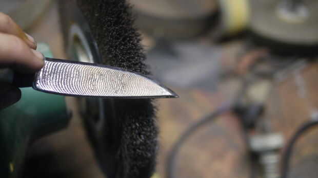 Ahora quiere eliminar algunas de la oxidación que está haciendo la mirada de la hoja un poco sucio. Utilicé un disco de cepillo de alambre, pero un cepillo de alambre manual funciona igual de bien. Ruedas de alambre lanzan cerdas acero como balas y se pasan por la ropa, usar siempre protección para los ojos.