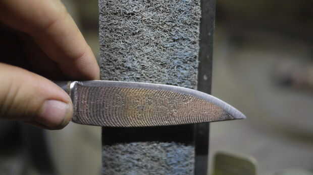 Una vez hecho esto dar la hoja de una mejora en el borde también. Como se muestra arriba, puede utilizar una rueda que pulimenta, bien mojada y seca o una cinta scotch. Tenga cuidado si utiliza una rueda que pulimenta, tienden a chupar cosas y escupir tan rápido. Soporte al lado mientras se está usando gafas de seguridad!
