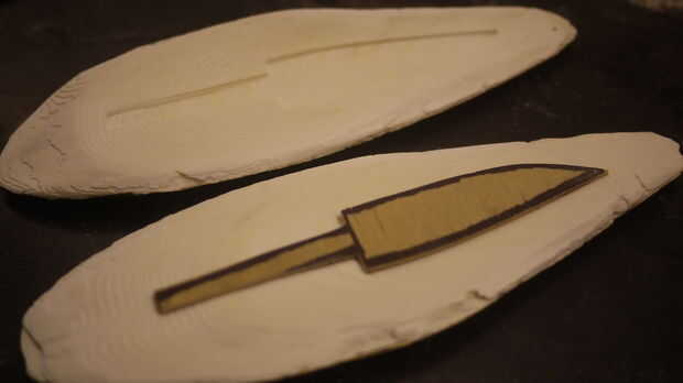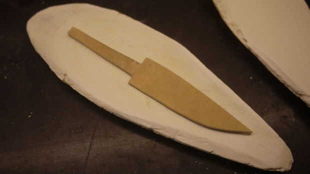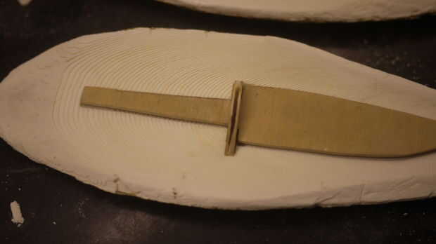 Una vez que la forma de la lámina se presiona uniformemente en ambos lados, ajuste el protector y empuje también. Es importante que tenga suficiente hueso de sepia para aislar un pour como esta. No desea que el metal fundido para quemar a través de los lados y caer.