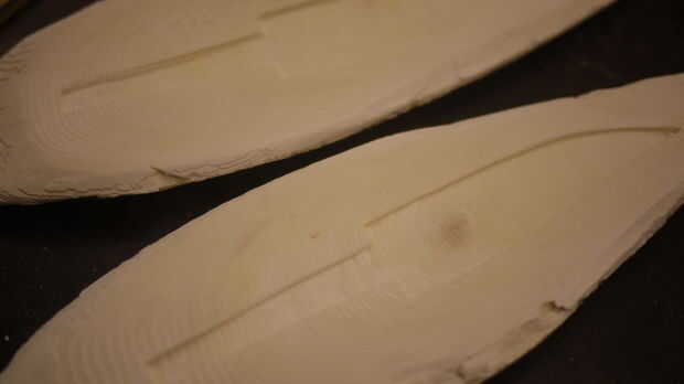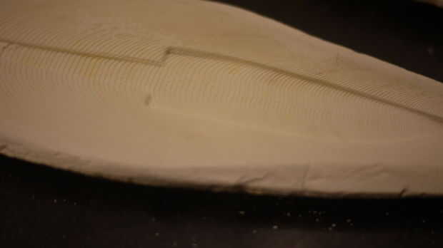 Con sus piezas de corte, es hora de empezar a presionar la forma en la sepia. Le aguanté la sepia y utilizado ambos mis pulgares para empujar el prototipo en el hueso de sepia. El prototipo se detendrá cuando el polvo triturado sepia rellena el agujero que está presionando. Para solucionar esto, la pieza y soplar el polvo fuera, y continúe presionando.